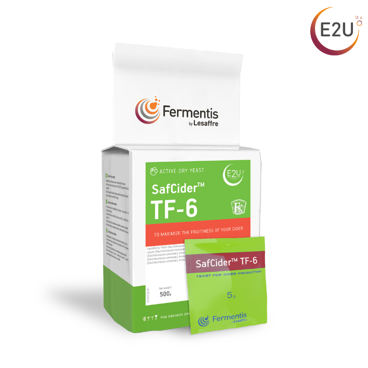 Використання Для солодкого та сухого сидру зі свіжого або концентрованого яблучного соку. Придатний для важких умов бродіння і сумішей з цукровими сиропами. Процедура регідратації: ① Пряме щеплення: Вилийте дріжджі на поверхню щонайменше в 10 разів більше їх ваги сусла (можливо, безпосередньо на верх резервуара або під час заповнення резервуару після освітлення). Обережно перемішайте, щоб уникнути або розбити грудки. Негайно перелийте в резервуар шляхом перекачування з аерацією (або гомогенізуйте об'єм резервуара). ② З попередньою регідратацією: Налийте дріжджі на поверхню в 10 разів більше їх ваги водопровідної води кімнатної температури. Обережно перемішайте, щоб уникнути або розбити грудки. Зачекайте 20 хвилин і перенесіть в резервуар за допомогою перекачування з аерацією.